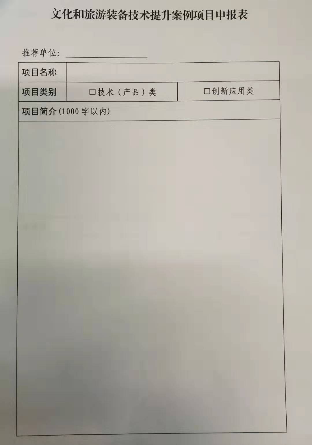 1.申报单位认真填写《文化和旅游装备技术提升案例项目申报表》(在文化和旅游部网站一工作动态一科技教育司栏目中下载),由推荐单位审核后盖章(一式5份)。