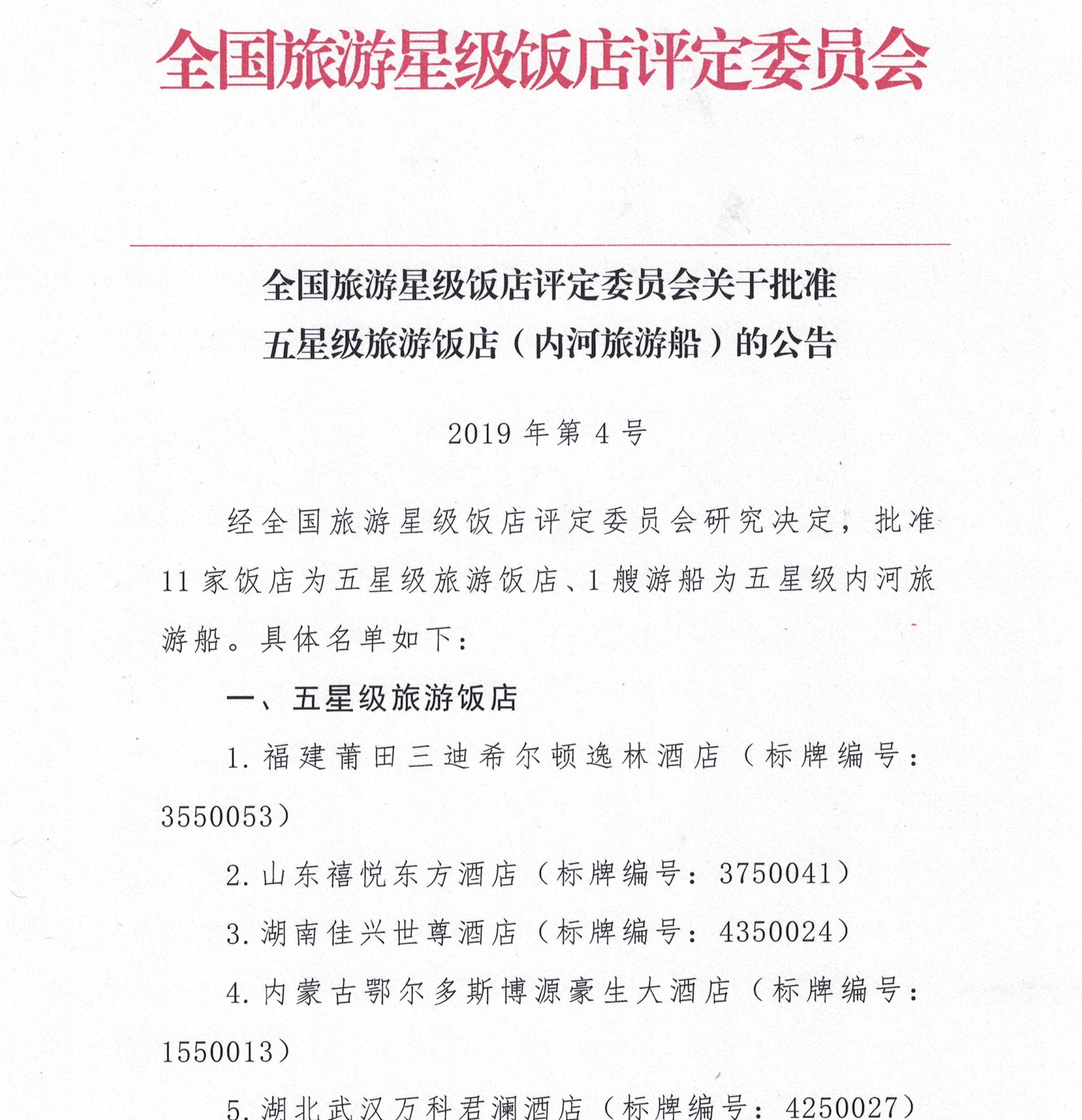 全国旅游星级饭店评定委员会关于批准 五星级旅游饭店(内河旅游船)的公告