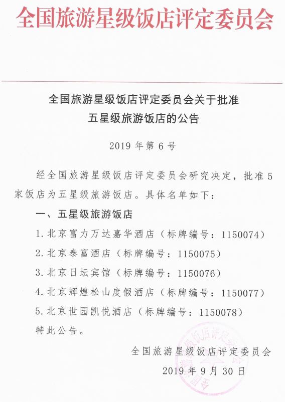 全国旅游星级饭店评定委员会关于批准五星级旅游饭店的公告2019年第6号